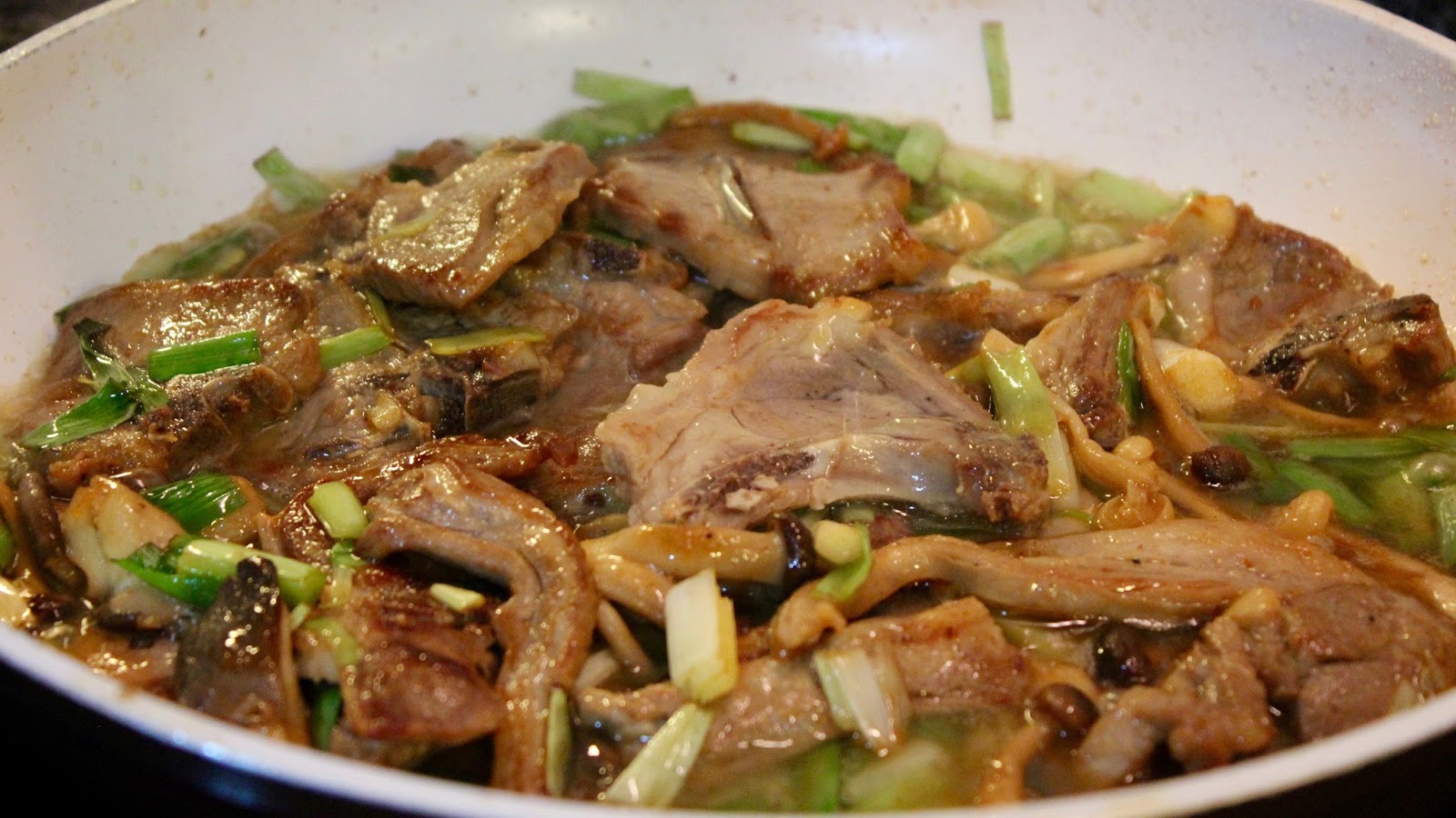 De primer trossejarem la carn i, en acabant, pelarem els alls, els traurem les arrels i la part verda i els trossejarem (els farem a trossos de dos o tres dits de llargària).