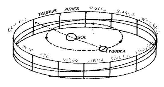 Podem fer-ne una mena de simulació: si el nostre cap representa la Terra i el puny el Sol, i posem el puny tancat a dos pams dels ulls, se’ns taparà una determinada porció de l’espai i les constel·lacions que acollia; però si, mantenint el puny en el mateix lloc, inclinem cap a un costat seran unes altres les estreles que deixaran de vore’s. Per això quan ara, més de vint-i-dos segles després d’aquell “mapa del cel” es diu que “estem en Àries” (“el Sol oculta Àries”) realment allò que el Sol ens tapa ara és una altra constel·lació, la de Piscis (“el Sol oculta Piscis”). I desplaçaments similars afecten la resta dels signes.