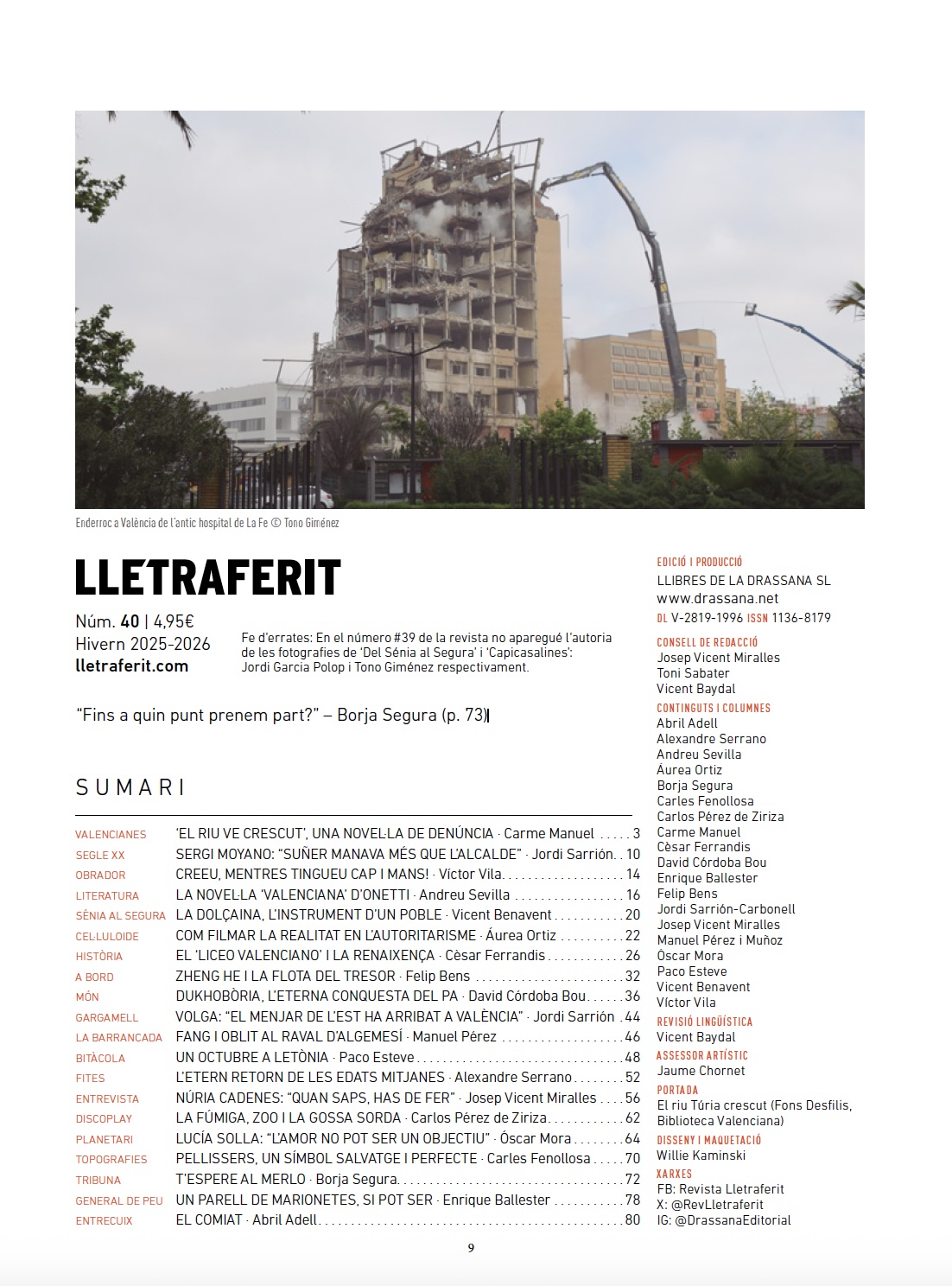 La revista Lletraferit acaba de publicar el seu número 40, corresponent a l’hivern 2025-2026, amb una portada dedicada a Maria Beneyto i la seua obra El riu ve crescut. La nova entrega manté el format habitual de 84 pàgines i oferix un ampli ventall de reportatges, entrevistes i columnes centrades en la cultura valenciana i en qüestions d’abast internacional.