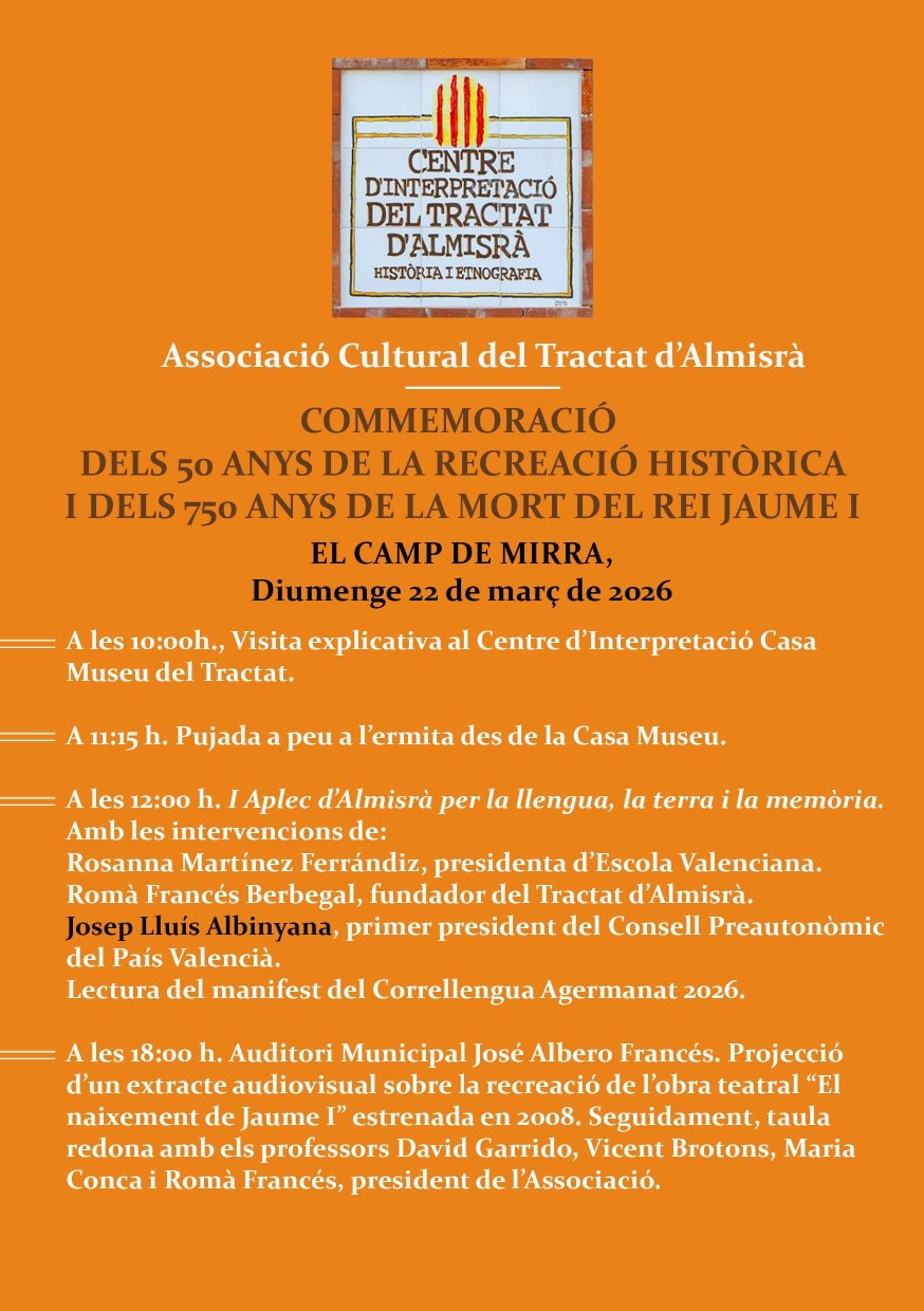 A les 12 hores tindrà lloc el I Aplec d’Almisrà per la llengua, la terra i la memòria, un espai de trobada amb intervencions de figures destacades de l’àmbit cultural i cívic, així com la lectura del manifest del Correllengua Agermanat 2026. Esta iniciativa naix amb la voluntat d’enllaçar el passat medieval amb els debats contemporanis sobre identitat, llengua i cohesió territorial .