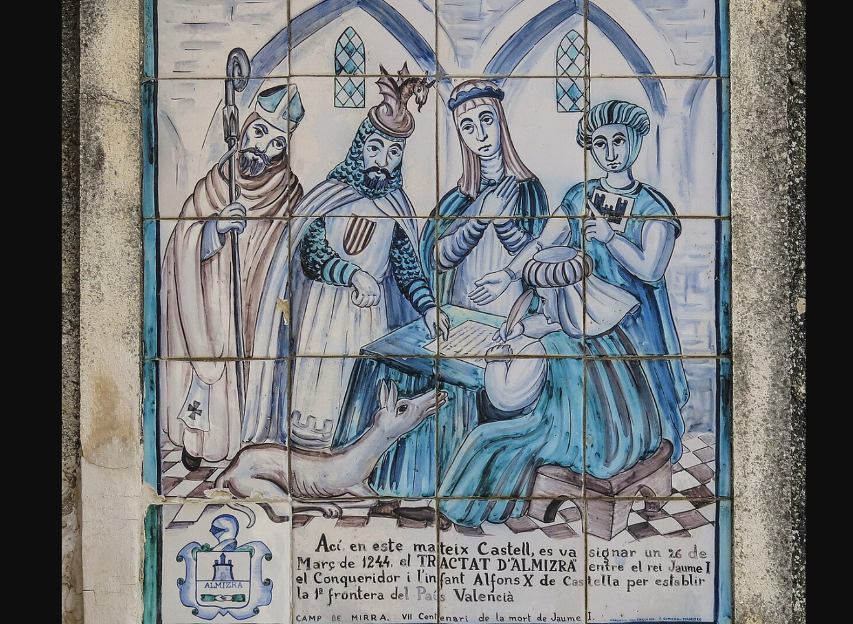 El Tractat d’Almisrà, signat el 26 de març de 1244 entre el rei Jaume I i l’infant Alfons de Castella en nom de Ferran III, va establir les fronteres entre la Corona d’Aragó i la de Castella al sud del futur regne valencià. El pacte va delimitar l’expansió territorial de cada corona i fixà la línia que marcaria, durant segles, la frontera meridional valenciana . Més enllà del seu valor polític, el tractat simbolitza també una manera de resoldre conflictes basada en la negociació, fet que ha contribuït a la seua projecció com a element identitari i pedagògic.