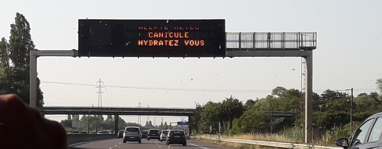 Durant un viatge de Metz (Lorena) a Nancy (Mosela), a França, el 26 de juny de 2019, els cartells lluminosos de l’autopista advertien sobre els perills de la ‘canicule’