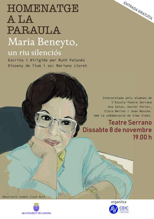 Este dissabte 8 de novembre el CEIC Alfons el Vell celebra el seu 29é Homenatge a la Paraula, dedicat a l’escriptora Maria Beneyto, amb l’espectacle Maria Beneyto. Un riu, silenciós basat en la seua novel·la El riu ve crescut. Es tracta d’una adaptació escrita i dirigida per Ruth Palonés i interpretada per diversos alumnes de l’Escola Teatre Serrano: Ana Salas, Xavier Ferrer, Clara Merino i Joan Moncho, amb la col·laboració de Ximo Vidal, i amb el disseny de llum i so de Mariano Lloret. L’espectacle tindrà lloc a les 19 h al Teatre Serrano amb entrada completament lliure.