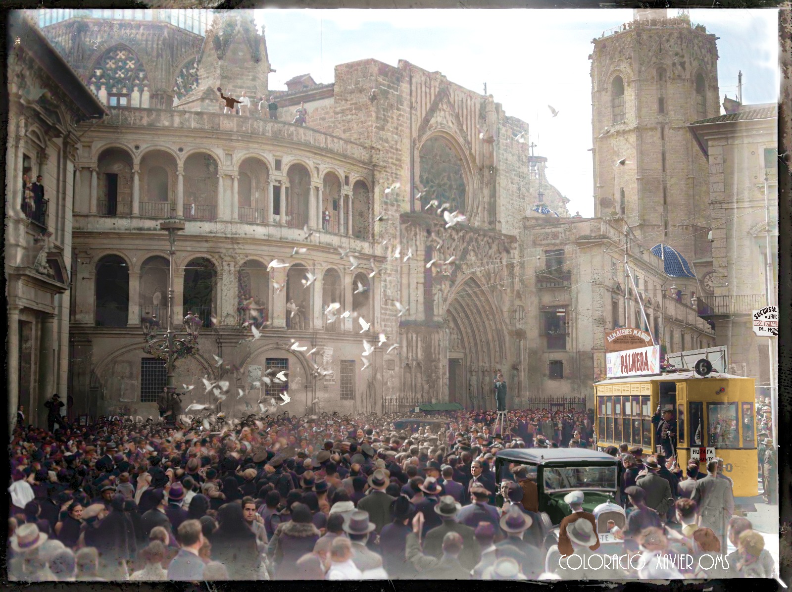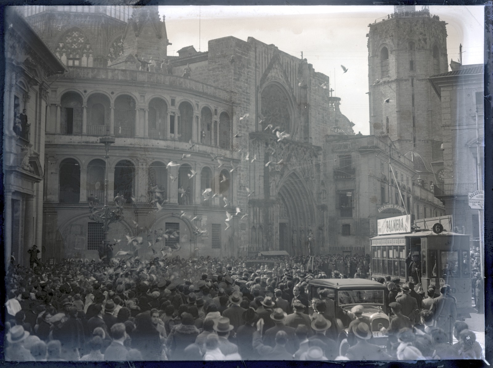 En esta fotografia d’Enrique Desfilis, nebot de Vicente Barberá Masip, se’ns mostra la plaça de la Mare de Déu en el moment del Toc de Glòria, toc que es feia no el Diumenge de Resurrecció, com segons de la lògica cristiana podria deduir-se, sinó la seua vespra, el Dissabte Sant. Fins a abans de la reforma litúrgica de la Setmana Santa introduïda pel papa Pius XII en la dècada de 1950, la resurrecció de Jesucrist es commemorava en el matí del dissabte, conegut com a Dissabte de Glòria. Des del dijous anterior havia estat prohibit el trànsit rodat pels carrers de València, així com la representació de qualsevol espectacle profà i l’execució o emissió de tota música que no fora religiosa. Però el dissabte, a les deu del matí, un volteig de campanes de la Seu, al qual s’unien les de la resta de parròquies, trencava el silenci i l’austeritat que des del Dijous Sant s’observava. Es soltaven desenes de coloms blancs, amb traques i l’alegre so del tabalet i la dolçaina.