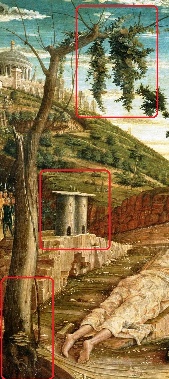 També s’hi troben representats un arbre mig abatut per un raig que podria ser un olm (Ulmus sp.), ja que els romans els usaven de suport per a les vinyes, com la que figura en la rama superior, per a evitar que el raïm (Vitis vinifera, símbol cristològic de primer nivell), tocara el terra i es podrira. Als peus i sobre el tronc es veuen uns bolets de soca, potser bolets de l’olm (Hypsizygus ulmarius), un fong oportunista que s’aprofita de la feblesa de l’arbre per a nodrir-se’n.
