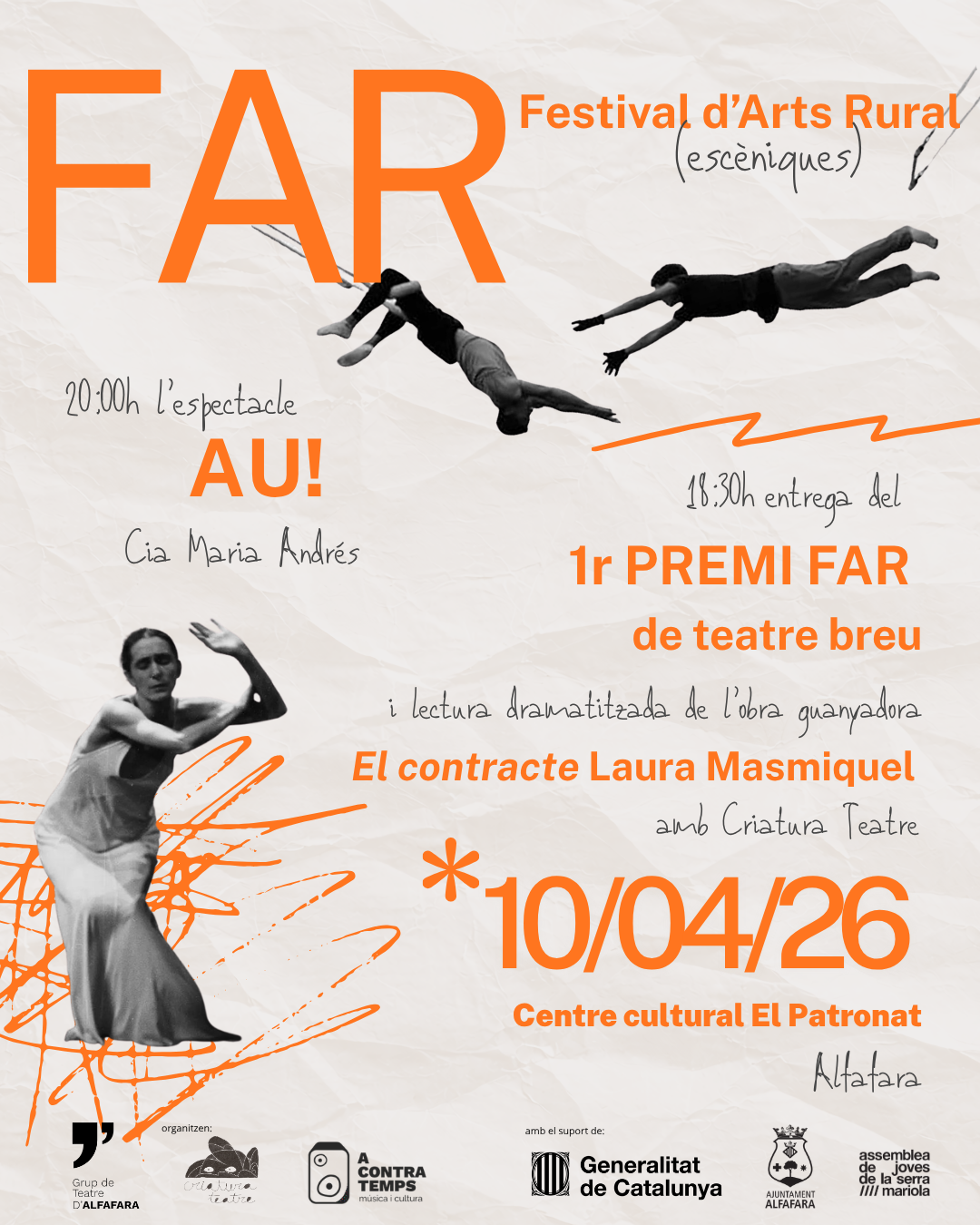 El Centre Cultural El Patronat d’Alfafara acull este divendres 10 d’abril la primera edició del Festival FAR: una vesprada de teatre contemporani amb l’entrega del Premi FAR de Teatre Breu, la lectura dramatitzada de l’obra guanyadora i l’espectacle AU!, de la Cia. Maria Andrés. Una proposta cultural gratuïta que, juntament amb la tradicional festa de La Cagà de la Burra que l’Associació Amics dels Reis d’Orient organitza al sendemà al poble, convertix Alfafara en una destinació ideal per gaudir de la Pasqua a l’interior de les comarques centrals valencianes.