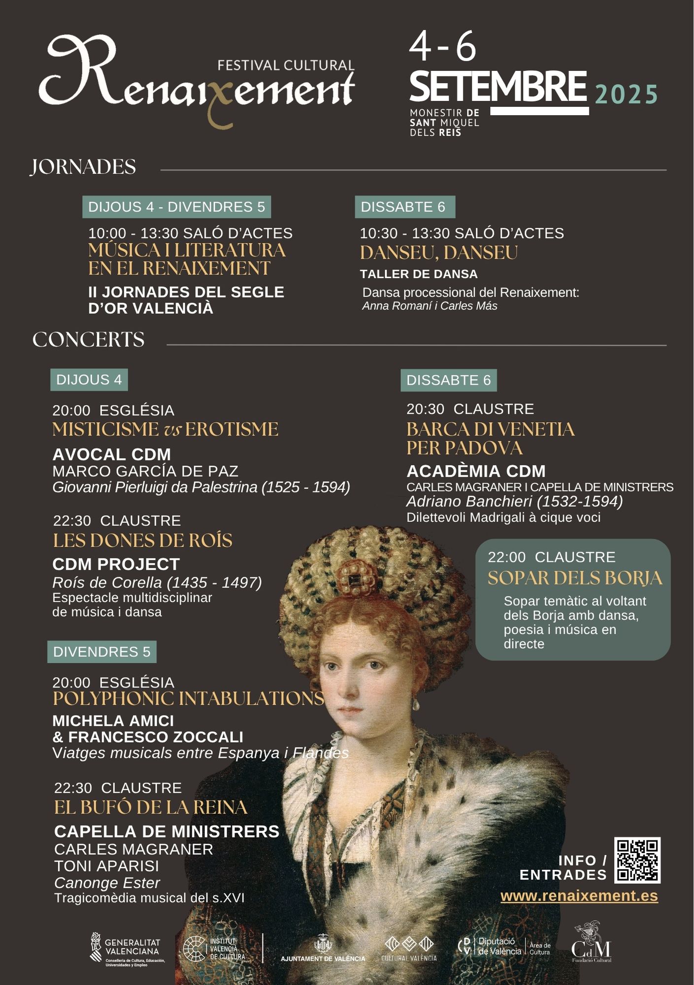 En definitiva, el Festival Renaixement 2025 manté l’essència de les seues edicions anteriors, però amplia els formats i reafirma la seua aposta per l’excel·lència artística i la interdisciplinarietat. Cada jornada combina continguts de reflexió i creació, en un recorregut que va des de la investigació musicològica i literària fins a la posada en escena contemporània. Les entrades, que es poden reservar en línia, inclouen opcions d’abonament per a diversos concerts i també paquets amb el sopar temàtic.