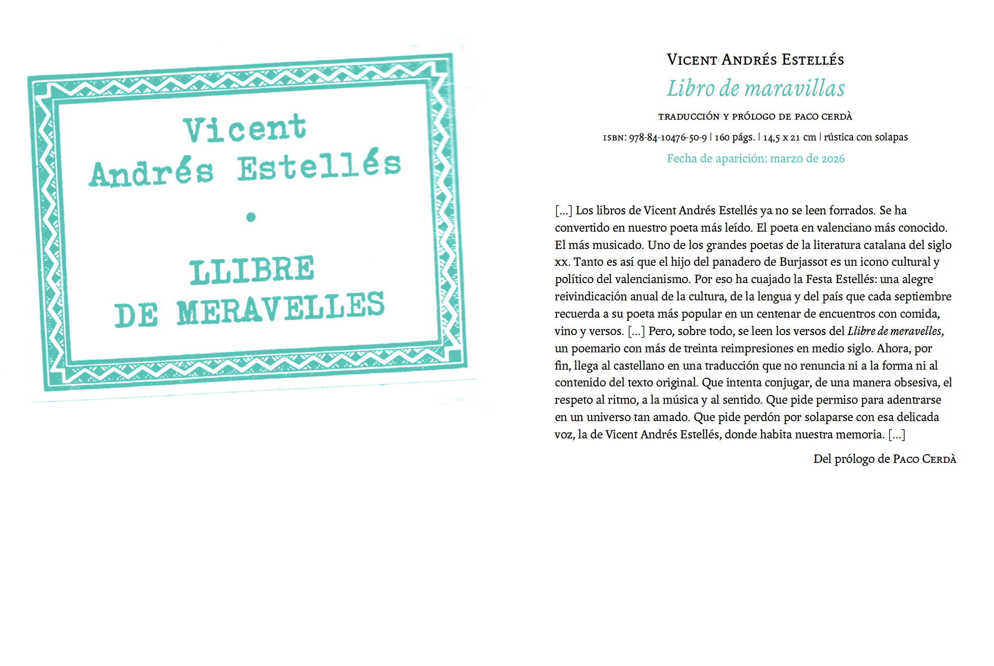 El Llibre de meravelles, considerat unànimement com el llibre més important i influent del poeta Vicent Andrés Estellés, es podrà llegir per primera vegada en castellà gràcies a la traducció del periodista i escriptor Paco Cerdà, que el publicarà en l’editorial Pepitas. La novetat, prevista per a les pròximes setmanes, suposa un esdeveniment editorial de gran rellevància i obri l’obra cabdal del poeta de Burjassot a un nou públic lector.