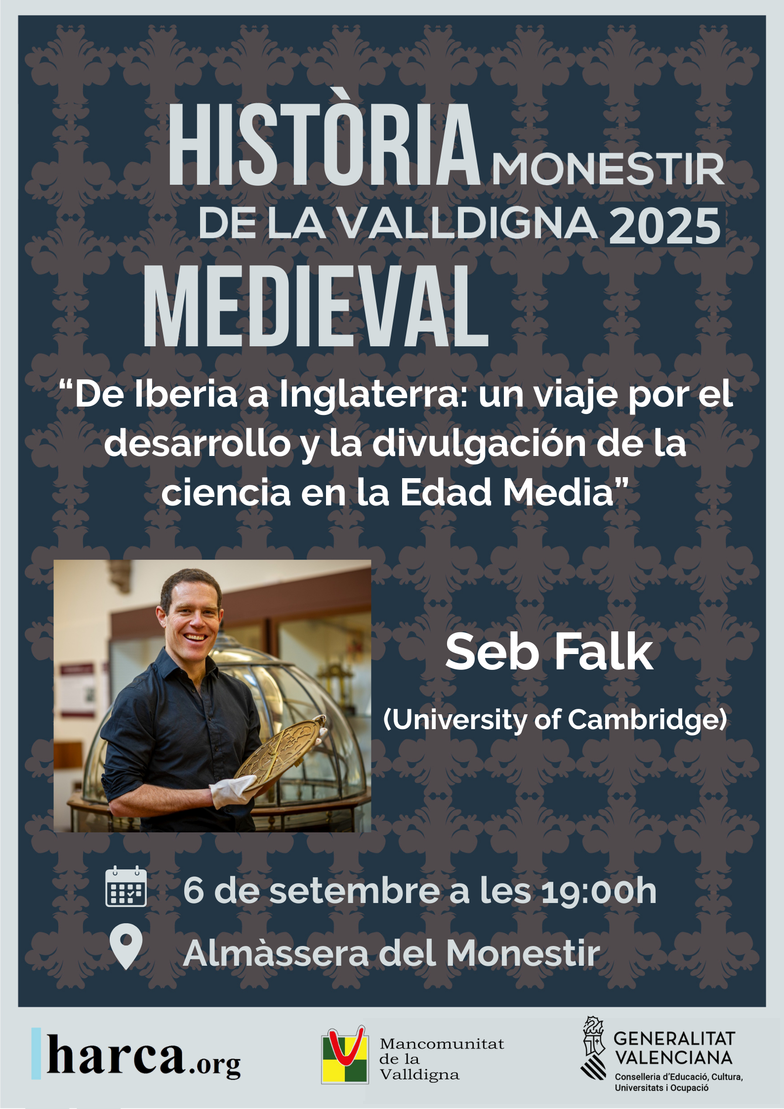 El Reial Monestir de Santa Maria de Valldigna acollirà, en definitiva, una cita ineludible per a tots aquells que vullguen mirar la ciència medieval amb uns altres ulls. Seb Falk ens recordarà que el passat no sempre és com ens l’han contat i que a l’Edat Mitjana es van produir avanços i reflexions que encara mereixen ser recordats i analitzats. Amb entrada lliure fins a completar l’aforament, el monestir de Simat de la Valldigna tornarà a ser punt de trobada per a la millor història, en un entorn monumental que reforça la màgia d’estes cites.