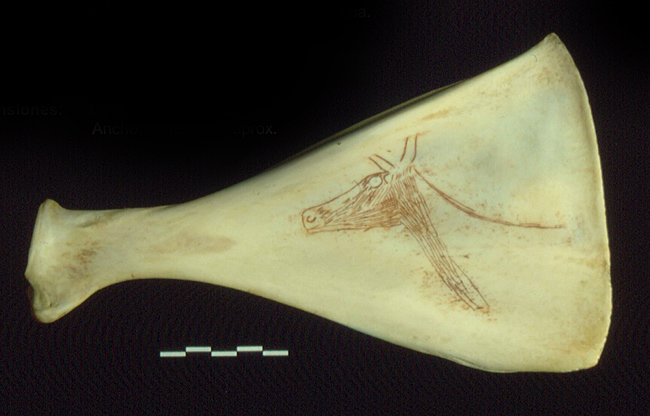 Omòplat gravat trobat a la cova d’Altamira (Cantàbria). En l’antiguitat, algunes cultures van fer servir omòplats d’animals com a art sumptuària; i a la Xina dels segles XVI-XV aC com a mecanisme endevinatori (escapulomància) a través de la interpretació màgica dels badats i marques que es formaven en els omòplats d’animals (ovelles, cérvols, porcs) quan s’escalfaven al foc.