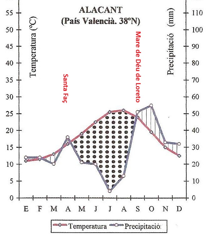Climograma de la comarca de l’Alacantí. Font: “La recerca de regularitats en la natura” (1999). Daniel Climent Giner. Ed. Aguaclara
