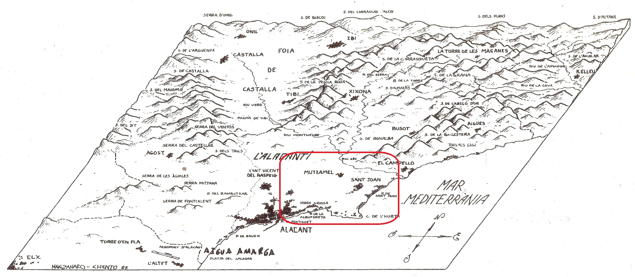 Mapa de la comarca de l’Alacantí, amb la subcomarca de l’Horta d’Alacant. Dibuix de Manzanaro i Chento en el llibre “Les formacions vegetals de la ciutat d’Alacant” (1990), de Daniel Climent i Carles Martín.