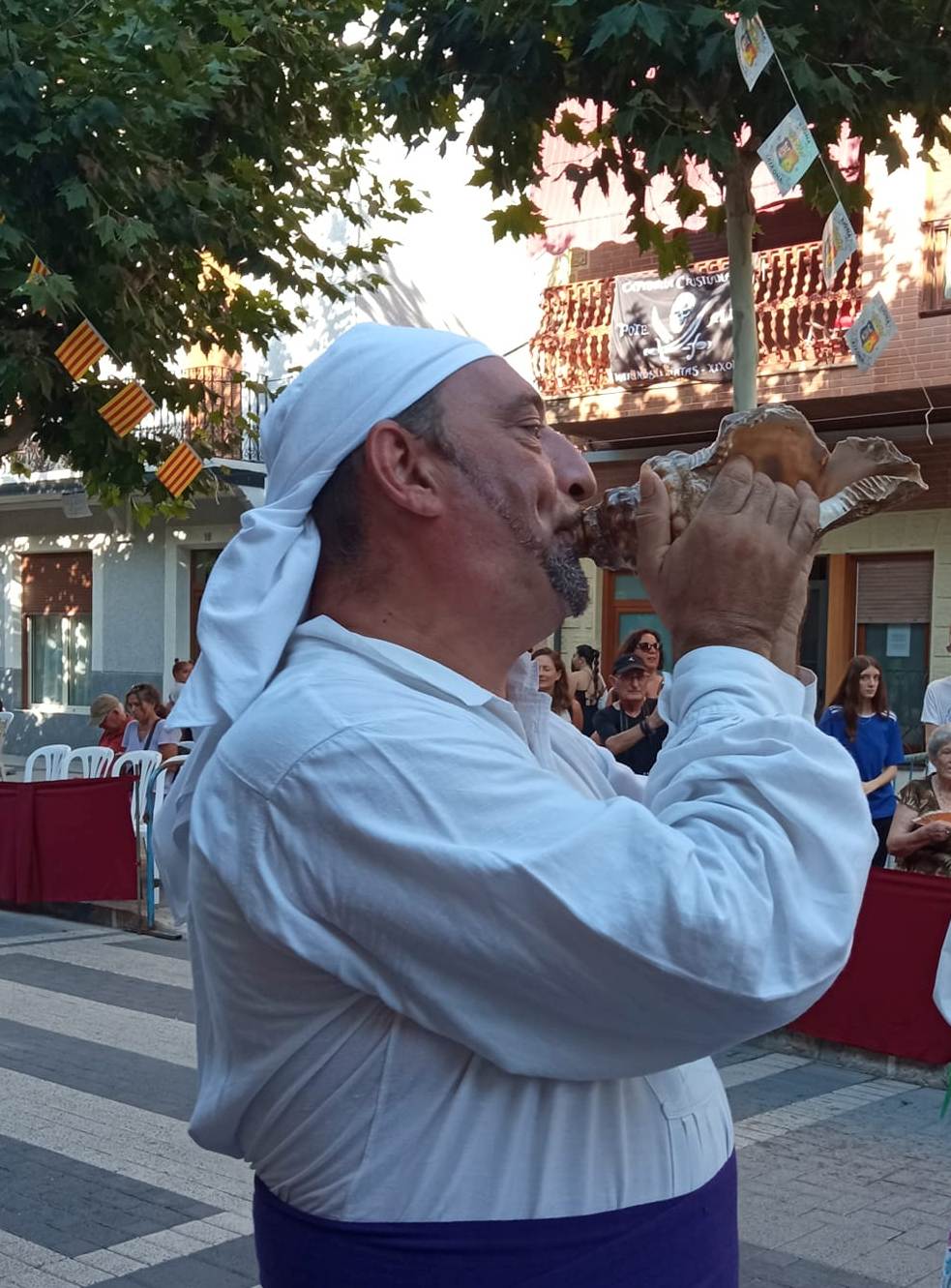 Representació del toc amb corna com avís de pluges fortes, de buidatge parcial del pantà de Tibi, o de pujada brusca del nivell de l’aigua en el llit del riu. Representació durant les Festes de Moros i Cristians de Xixona (l’Alacantí).