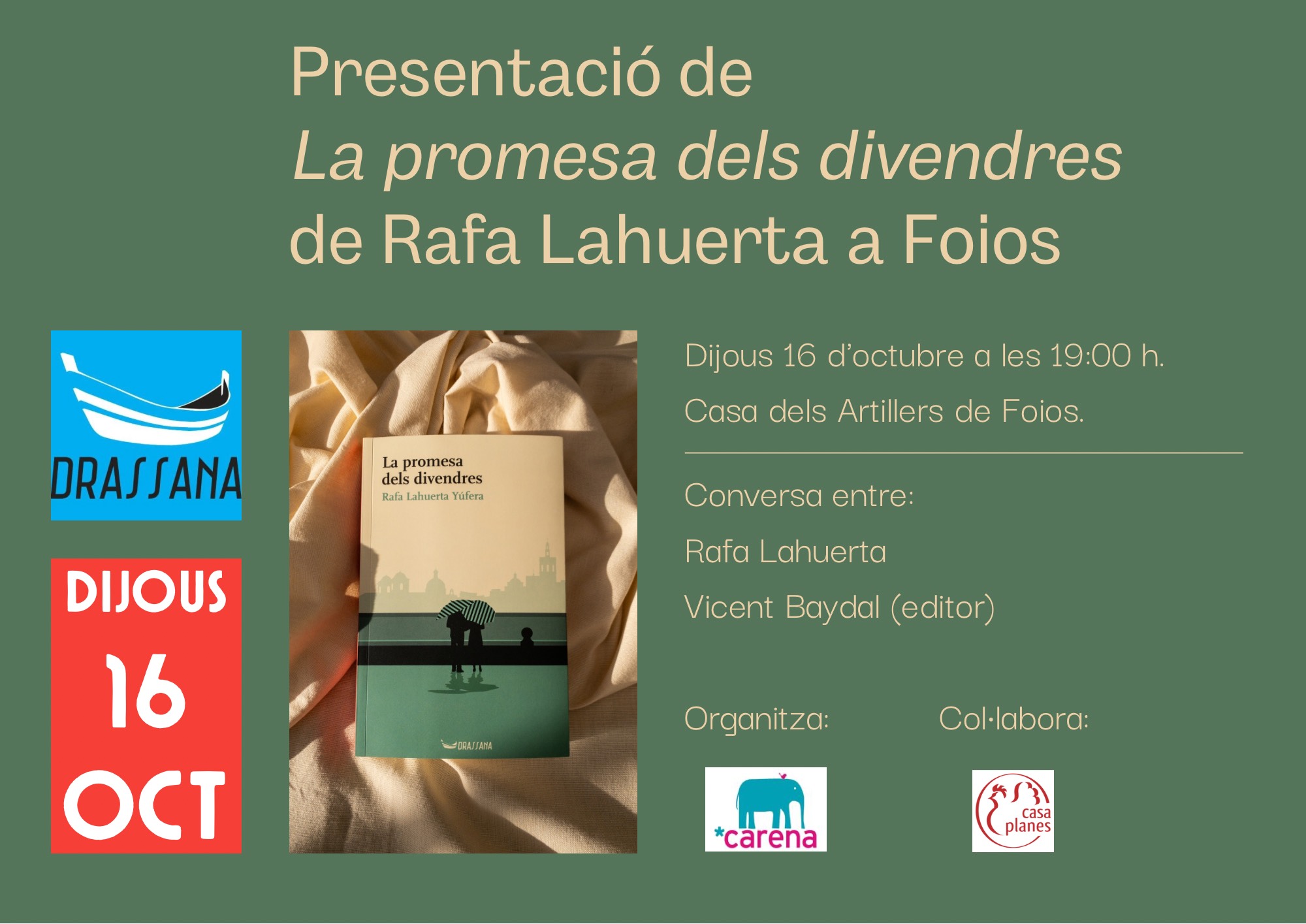 La localitat de Foios, a l’Horta Nord, es prepara per a rebre un dels autors més llegits i estimats de la literatura valenciana contemporània. Este dijous 16 d’octubre, a les 19:00 hores, la Casa dels Artillers (Av. Hugo Bacharach, 15) acollirà la presentació de La promesa dels divendres, la darrera novel·la de Rafa Lahuerta, publicada per Llibres de la Drassana. L’acte, organitzat per l’associació Carena de suport psicològic contra el càncer, comptarà amb una conversa entre l’autor i l’editor Vicent Baydal, que oferirà una mirada compartida sobre el llibre, el seu rerefons i el seu significat.