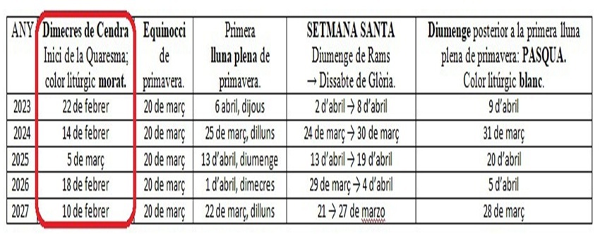 El primer dia de la Quaresma rep el nom de Dimecres de Cendra. Però què significa això? ¿Com es determina eixe dia, per a qualsevol any? O, encara més, ¿quin és el dia a partir del qual s’ha de comptar cap enrere quaranta dies per decidir l’inici quaresmal? Vegem-ho.