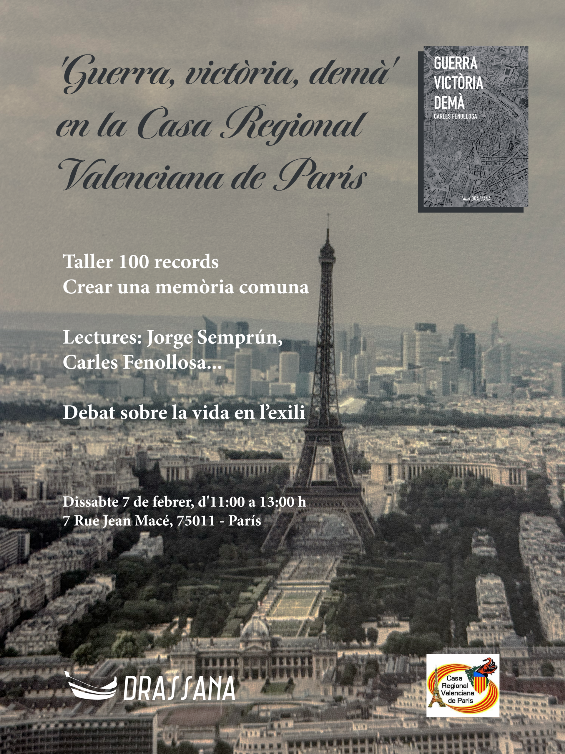 La participació de Carles Fenollosa donarà al taller un caràcter especial. L’autor llegirà fragments de la seua novel·la Guerra, victòria, demà, una obra recent que aborda la Segona República, la guerra i l’exili valencià a França després de la derrota republicana. El llibre resseguix la trajectòria de Jesús Martorell, un metge valencianista que després de la guerra es veu obligat a refer la seua vida a París, on trobarà una certa estabilitat i visitarà de manera fugaç a la mateixa Casa de València, fundada el 1947 com a punt de trobada dels exiliats valencians a la capital francesa.