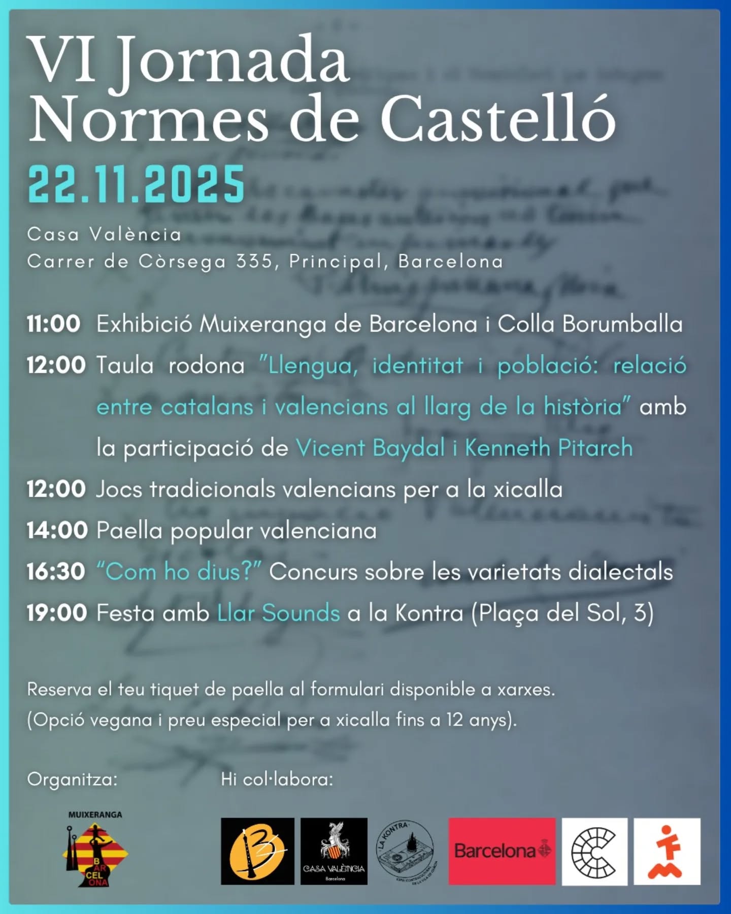 Barcelona es prepara per viure este dissabte 22 de novembre una nova edició de la Jornada de les Normes de Castelló, un esdeveniment ja consolidat en el calendari cultural valencià a la capital catalana, amb sis edicions. La trobada, organitzada per la Muixeranga de Barcelona a la Casa València (C/ Còrsega, 335), vol reivindicar un any més el llegat de les Normes de 1932 i reforçar els vincles entre el col·lectiu valencià resident a Catalunya i la cultura del país. La VI Jornada arribarà amb una programació festiva, divulgativa i oberta a tot el món, amb un acte de debat previst per a les 12:00 hores, que reunirà el medievalista Vicent Baydal i el demògraf Kenneth Pitarch en un diàleg sobre llengua, identitat, nació i població al llarg de la història compartida entre valencians i catalans.