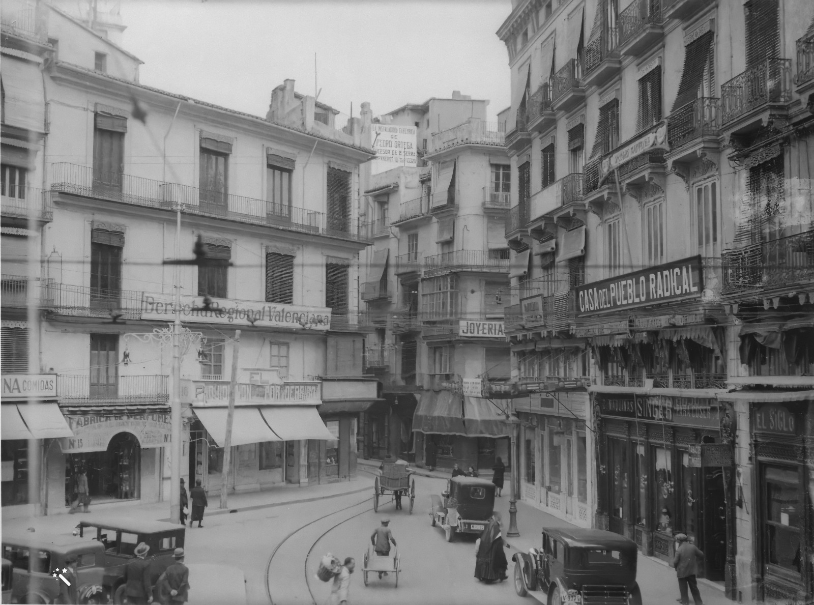 Seguint amb la foto de José Lázaro Bayarri, crida l’atenció els locals socials de dos partits d’ideologies contraposades: a l’esquerra –paradoxalment– el de la Derecha Regional Valenciana, i a la dreta la Casa del Pueblo Radical. Llegim en La Correspondència de València del 15 d’abril d’aquell any que, en passar la banda de música del Regiment Guadalajara per davall del balcó de la Derecha Regional Valenciana, van demanar que es detingueruen hissant tot seguit una bandera republicana al costat de la Senyera, mentre la banda interpretava “La Marsellesa”. A la dreta de la fotografia són visibles també el comerç dedicat a la venda de màquines de cosir Singer, que oferia a més cursets gratuïts de costura, tall i brodat, i just al costat el Gran Café El Siglo, que feia cantonada amb el carrer de la Pau, que amenitzava musicalment i en directe els seus clients tots els dies, de 6 a 8 de la vesprada i de 10 a 12 de la nit amb “selectas composiciones de autores nacionales y extranjeros”.