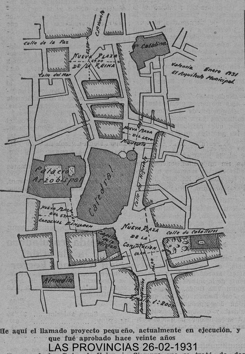 1931 no només va ser un any políticament decisiu per a Espanya, sinó també per a la vida quotidiana de la ciutat de València. Unes eleccions, en principi municipals, es van convertir en un plebiscit entre monarquia i república com el mateix comte de Romanones presagiava. I no es va enganyar, el 14 d’abril de 1931 la República era proclamada en les principals ciutats de l’Estat. La vaga general de 48 hores i la revolta dels capitans Fermín Galán i Ángel García en desembre de l’any anterior evidenciaven la tensió social i política del moment. I mentrestant, l’almanac de Las Provincias comentava en l’inici del nou any, l’auge que estava prenent la Cena de las Uvas en hotels restaurants i fins i tot en cases particulars, el 7 de gener, l’òptic Luis Crumiere comunicava a l’alcalde el tancament del seu establiment en la plaça de Santa Caterina amb la finalitat que pogueren mamprendre’s les reformes de la plaça de la Reina. Febrer va donar a llum una nova sala teatral al carrer General Sanmartín, al qual van donar per nom Alkázar, amb l’estrena d’El Dragón del Patriarca de Maximilià Thous, amb una jove actriu anomenada Amparito Rivelles, i el dimarts 24 de març de 1931 el Palacio Blanco, comerç dedicat a la venda de roba blanca i gèneres de punt situat en la plaça de la Reina números 15 i 16, comunicava als seus clients en la premsa valenciana, el començament d’una “gran liquidación por derribo”. I és que, a punt de concloure’s la reforma de la plaça d’Emilio Castelar, l’ajuntament reprenia la de la plaça de la Reina.