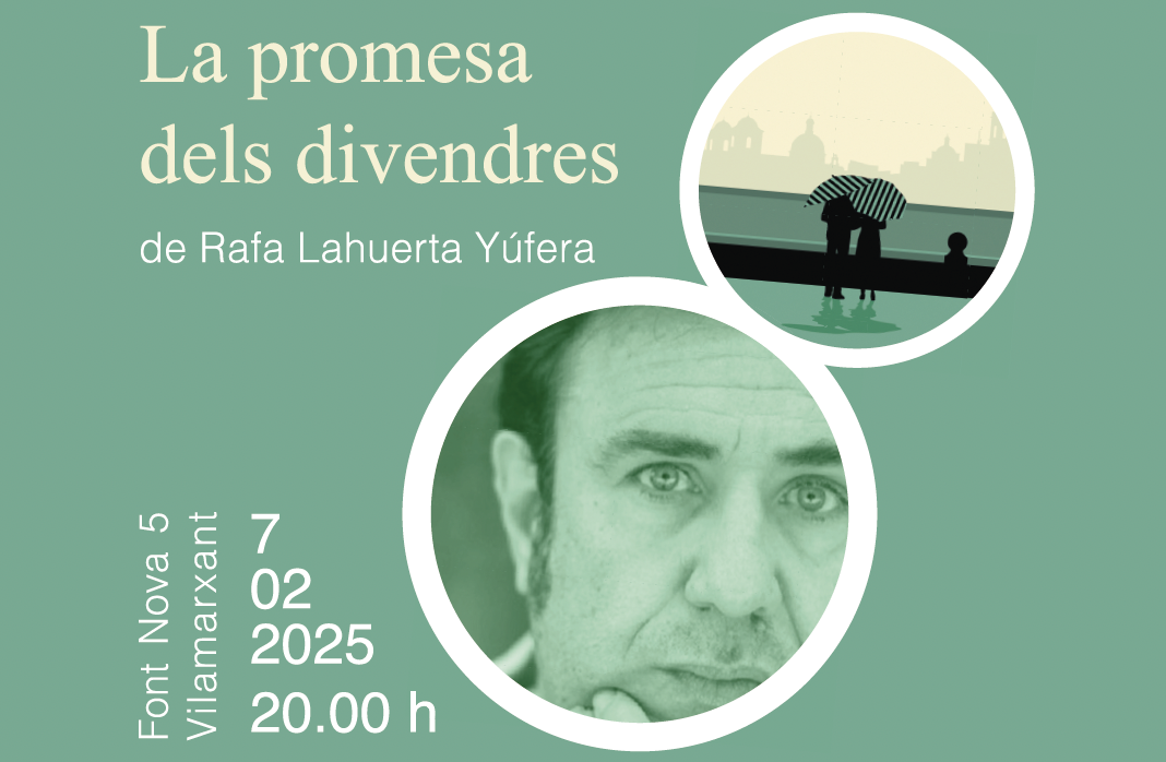 Este divendres 7 de febrer, a les 19:00 hores, Vilamarxant serà el punt de trobada per als amants de la literatura amb la presentació del llibre La promesa dels divendres, de Rafa Lahuerta. L’acte, organitzat per l’Associació Cultural 9 d’Octubre, dedicada a a la promoció i ús del valencià i a la difusió de la cultura, comptarà amb la presentació del reconegut escriptor Alfons Cervera (Xestalgar, 1947) i la presència de l’autor.