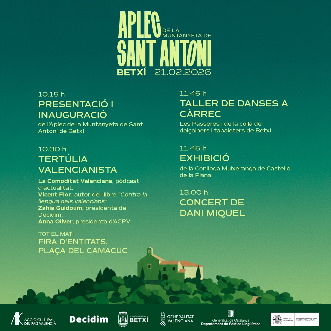 Betxí acollirà este dissabte 21 de febrer una nova edició de l’Aplec de la Muntanyeta de Sant Antoni, una jornada de trobada, cultura popular i compromís cívic que convertirà este espai emblemàtic en punt de referència del valencianisme cultural i social. La iniciativa està organitzada per Acció Cultural del País Valencià, Decidim i l’Ajuntament de Betxí, amb l’objectiu d’enfortir el teixit associatiu, promoure la llengua i generar espais de reflexió i convivència oberts a tota la ciutadania. Així, al llarg del matí, la Muntanyeta de Sant Antoni acollirà una programació que combina pensament crític, cultura popular i música, amb activitats pensades per a públics de totes les edats. L’Aplec es planteja com una trobada intergeneracional, participativa i oberta, que consolida esta cita com un espai de complicitats entre entitats i col·lectius que treballen per la llengua i els drets culturals.