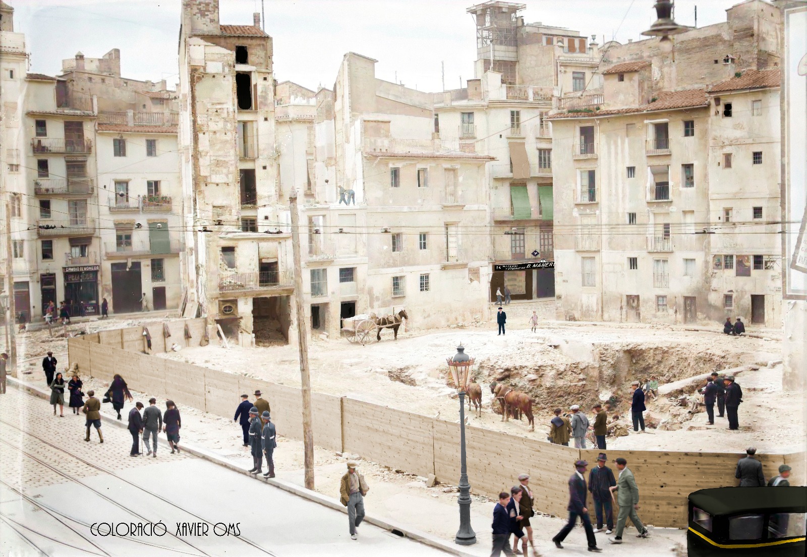 Hi ha fotografies que a penes necessiten explicacions per a situar-les en l’espai, però no és el cas d’esta imatge presa per Enrique Desfilis Barberá, en la qual només la perspicaç mirada d’algun coneixedor de la ciutat de València i el seu passat més recent és capaç de descobrir l’únic edifici que perdura enmig d’estes ruïnes que prompte seran enderrocs, solars, nova avinguda i admirables edificis. Ruïnes que un dia van ser habitatges i comerços de barri, carrers amb entranyables noms que van quedar en l’oblit. Com el de Les Fonts, l’empedrat del qual va eixir a la llum durant l’execució d’unes obres de clavegueram en l’avinguda de Maria Cristina fa quatre anys. El dels Matalafers, citat segons Marc Antoni Orellana ja en 1642 en un ban del Consell de la Ciutat; el de les Roses, conegut també com el de les Flors, i la mateixa plaça de Caixers, aquella placeta de la qual molts hem sentit parlar i pocs hem conegut enmig del carrer de Sant Vicent, que marcava l’inici de la Baixada de Sant Francesc. De tot això, només queda en peus eixe edifici clau per a situar correctament la fotografia, aquell que es veu al fons i en els baixos del qual s’aprecia la casa de fotografies de B. Manero, justament en el número 14 de la plaça dels Porxets, mut testimoni d’una transcendental reforma urbana iniciada en desembre de 1928 amb l’enderrocament de l’edifici número 14 de la plaça Emilio Castelar.