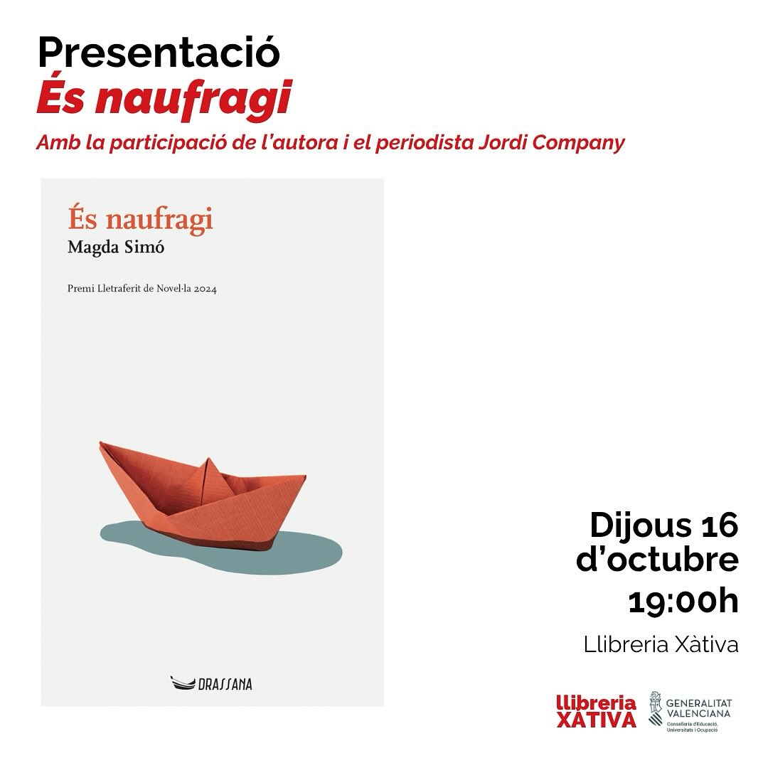 La Llibreria Xàtiva (C/ Fuente Alòs, 3) acull este dijous 16 d’octubre, a les 19:00 hores, la presentació d’És naufragi, la novel·la de Magda Simó guardonada amb el Premi Lletraferit de Novel·la 2024. L’acte comptarà amb la participació de l’autora i del periodista de la Cadena SER Jordi Company, amb qui conversarà al voltant d’un llibre que ja ha començat a marcar un camí propi dins de la narrativa valenciana contemporània.