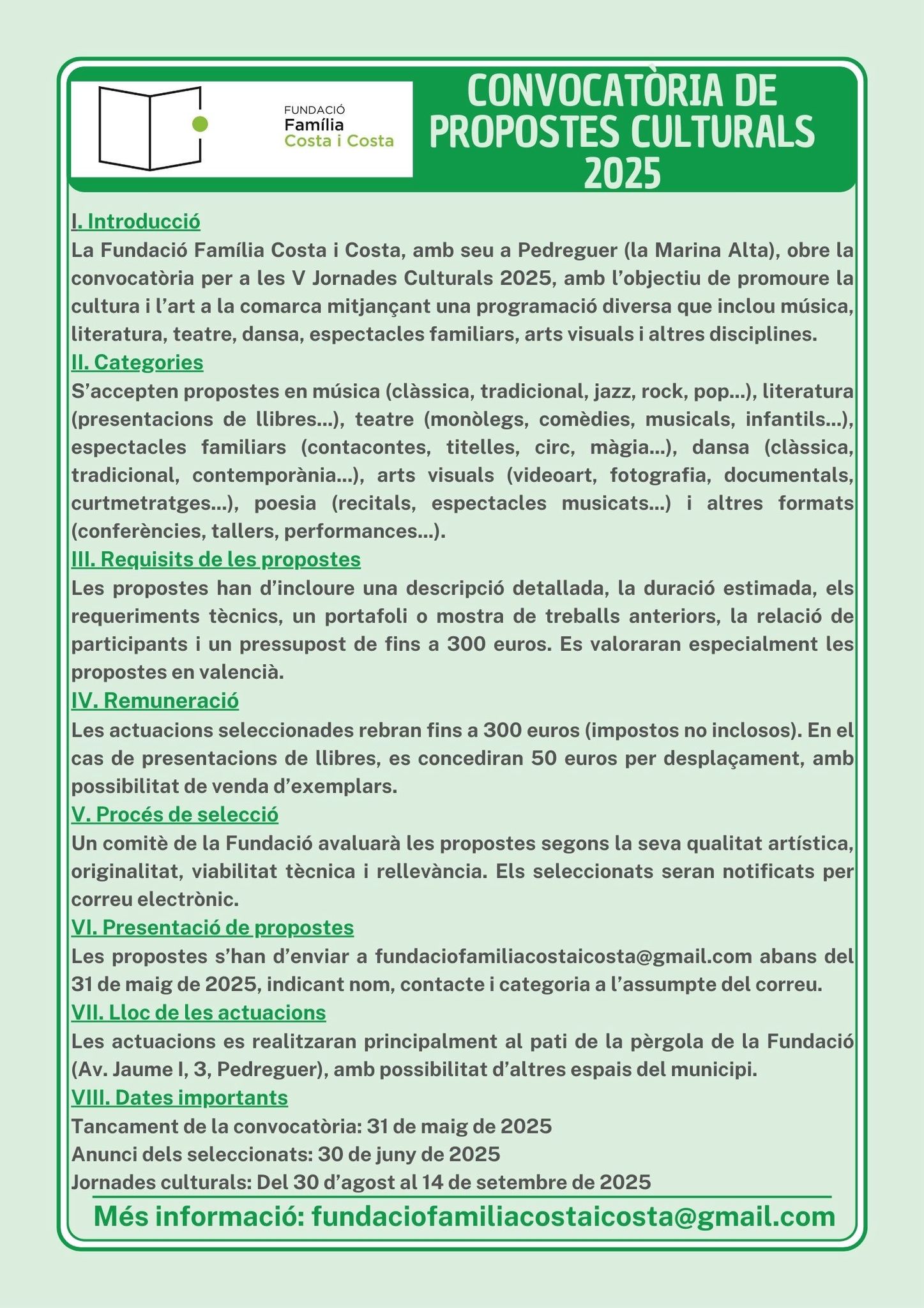 La Fundació Família Costa i Costa ha obert la convocatòria per a la presentació de propostes culturals per a les V Jornades Culturals 2025, que tindran lloc a Pedreguer del 30 d’agost al 14 de setembre. La iniciativa té com a objectiu promoure la cultura i l’art a la Marina Alta i més enllà, oferint una programació variada que inclou música, teatre, literatura, dansa, arts visuals, espectacles familiars i altres disciplines.