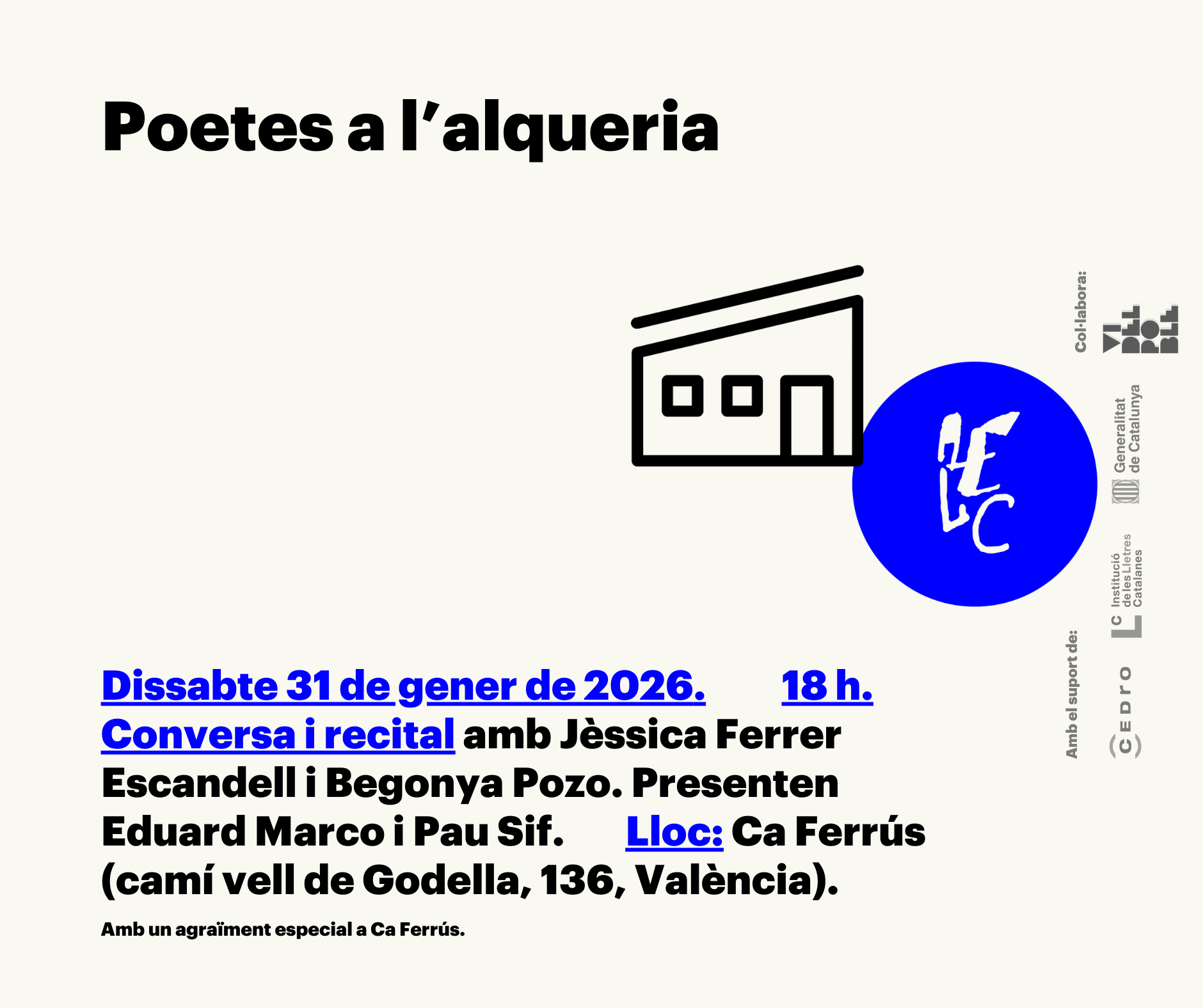 Este dissabte 31 de gener a les 18 h, la poesia pren de nou l’alqueria de Ca Ferrús a Borbotó, en una invitació oberta a viure l’horta i la paraula en contacte directe. No debades, Poetes a l’Alqueria, el cicle literari impulsat per l’AELC, celebra la seua tercera convocatòria del trimestre amb una proposta que combina conversa i recital amb dues creadores de generacions i sensibilitats diverses. En concret, la cita reunirà a Jèssica Ferrer Escandell i a Begonya Pozo, que compartiran el seu univers poètic amb el públic que vullga acostar-se al Camí vell de Godella, 136.