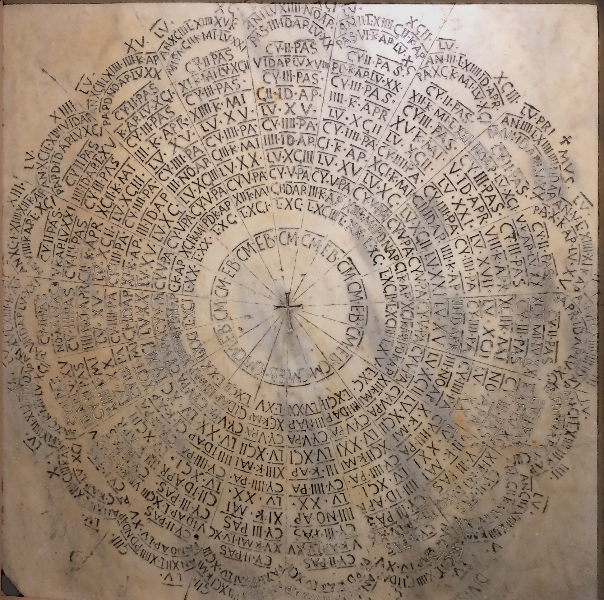Calendari conservat al Museu de la Catedral de Ravenna (Emília-Romanya, Itàlia). En el marbre figuren gravades les dates de la Pasqua entre els anys 532 i 626, amb cinc cicles de 19 anys (cicles metònics) representats com a cercles concèntrics. En combinar els calendaris solar i lunar es pot visualitzar que les fases de la Lluna coincidixen cada 19 anys i predir amb relativa aproximació les dates de la Setmana Santa, fent servir el calendari romà i el dia del mes lunar.