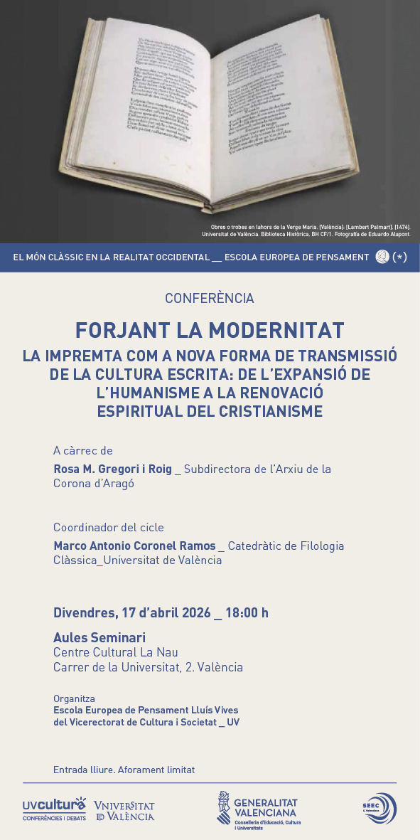 La historiadora i arxivera valenciana Rosa M. Gregori oferix este divendres 17 d’abril a les 18:00 hores una nova conferència a l’Escola Europea de Pensament Lluís Vives, dins del cicle El món clàssic en la realitat occidental, que té lloc al Centre Cultural La Nau de València. Amb el títol Forjant la modernitat: la impremta com a nova forma de transmissió de la cultura escrita, la intervenció proposa un recorregut pel paper decisiu de la impremta en la configuració de la cultura europea. Així, la sessió abordarà com la invenció tipogràfica va transformar els usos de la lectura i l’escriptura, va facilitar la difusió del coneixement i va contribuir a l’expansió de l’humanisme i a la renovació espiritual del cristianisme en els segles XV i XVI.