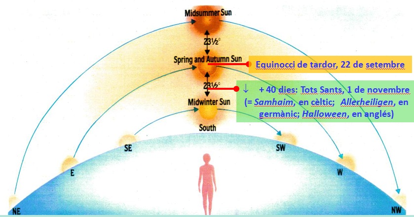 I el mateix pel que fa a l’inici de la mala estació (i també del nou any), que no coincidia amb l’equinocci de la tardor (≈ 22 de setembre) indicador de la victòria progressiva de la foscor sobre la llum, sinó quaranta dies després, l’1 de novembre, el Samhain dels celtes, antecessor del nostre Tots Sants.