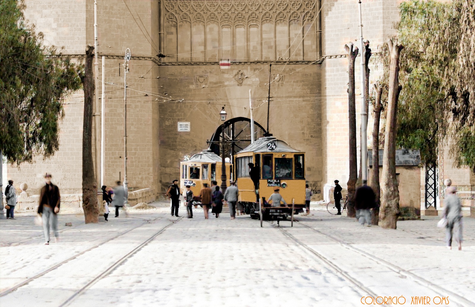 En 1927, l’Ajuntament de València havia pres la decisió de prohibir que circularen els tramvies per davall de les Torres dels Serrans al·legant que les seues vibracions podien danyar l’estructura -cosa que mai van fer amb les de Quart, supose que pensarien que estaven fetes d’una altra pasta i que no els afectaven-. En relació amb això, cal dir que en 1928 la CTFV (Companyia de Tramvies i Ferrocarrils de València) va canviar la numeració dels tramvies suburbans, passant a correspondre el disc 20 per a la línia a Catarroja i Silla, el 21 a Torrent, el 22 a Manises, el 23 a Burjassot i Godella i el 24 (el de la foto) a la Pobla de Farnals. I, segons les guies de l’època, la cartel·la en negre de la línia 24 que arribava fins a Massamagrell i la Pobla de Farnals es va començar a usar en els anys 30, ja que anteriorment era de color marró i en la dècada dels 40 blanca amb una banda en diagonal de color roig. Tot això confirma que la imatge està presa en la dècada dels 30.