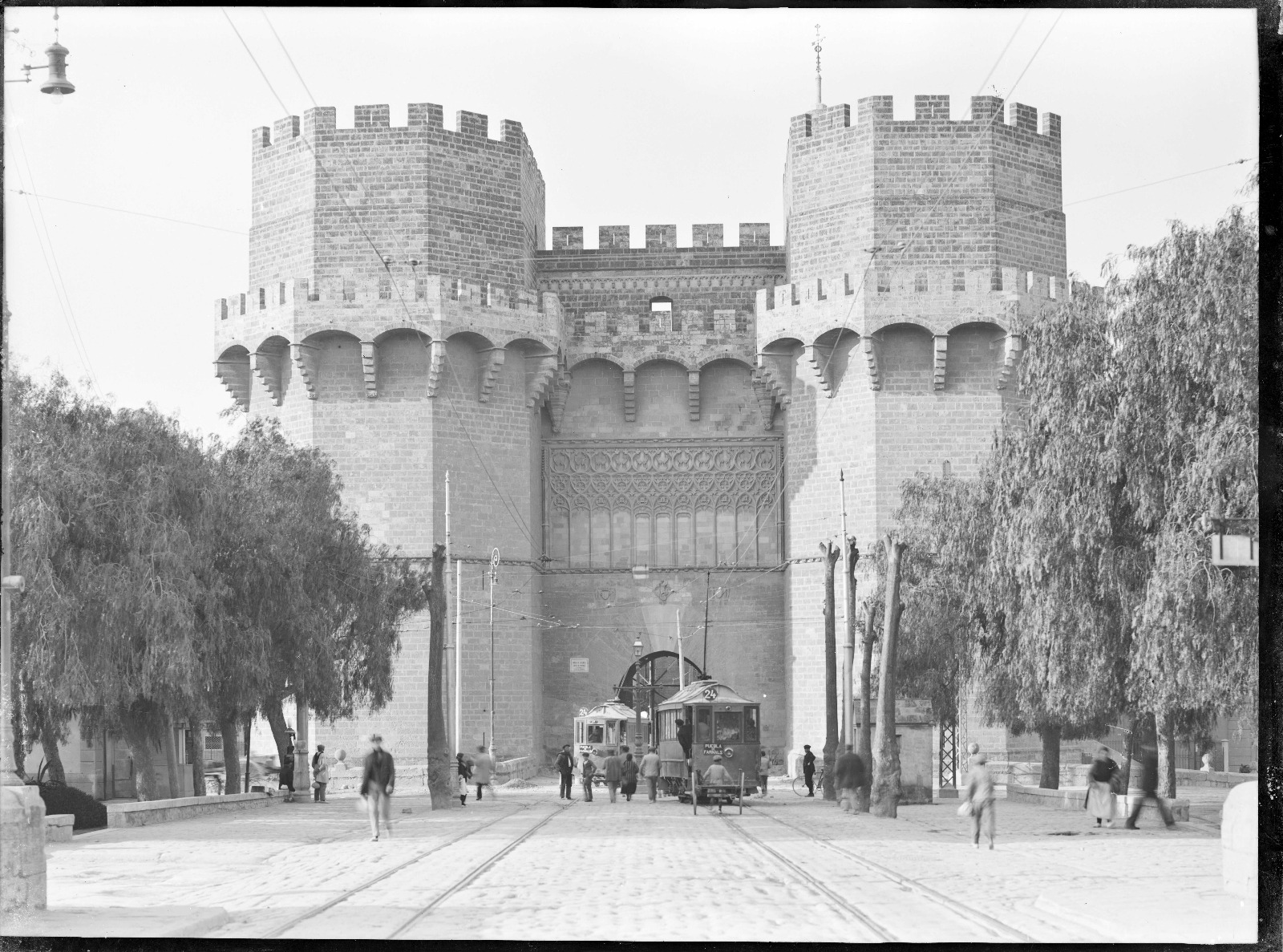 Hi ha dos coses que em criden l’atenció en esta fotografia, que és, en realitat, una ampliació d’una altra més extensa de l’estudi Barberà Masip-Desfilis (que es pot vore més avall). La primera és l’estranya maniobra dels dos tramvies i la segona el que sembla ser una bastida que s’observa darrere de la Porta i Torres dels Serrans, que podria donar una pista sobre la data aproximada en què es va fer la fotografia. El que sí que és evident és que va ser presa entre els anys 1930 i 1938 com a molt, perquè és l’any en què va cessar l’activitat de l’esmentat estudi fotogràfic.