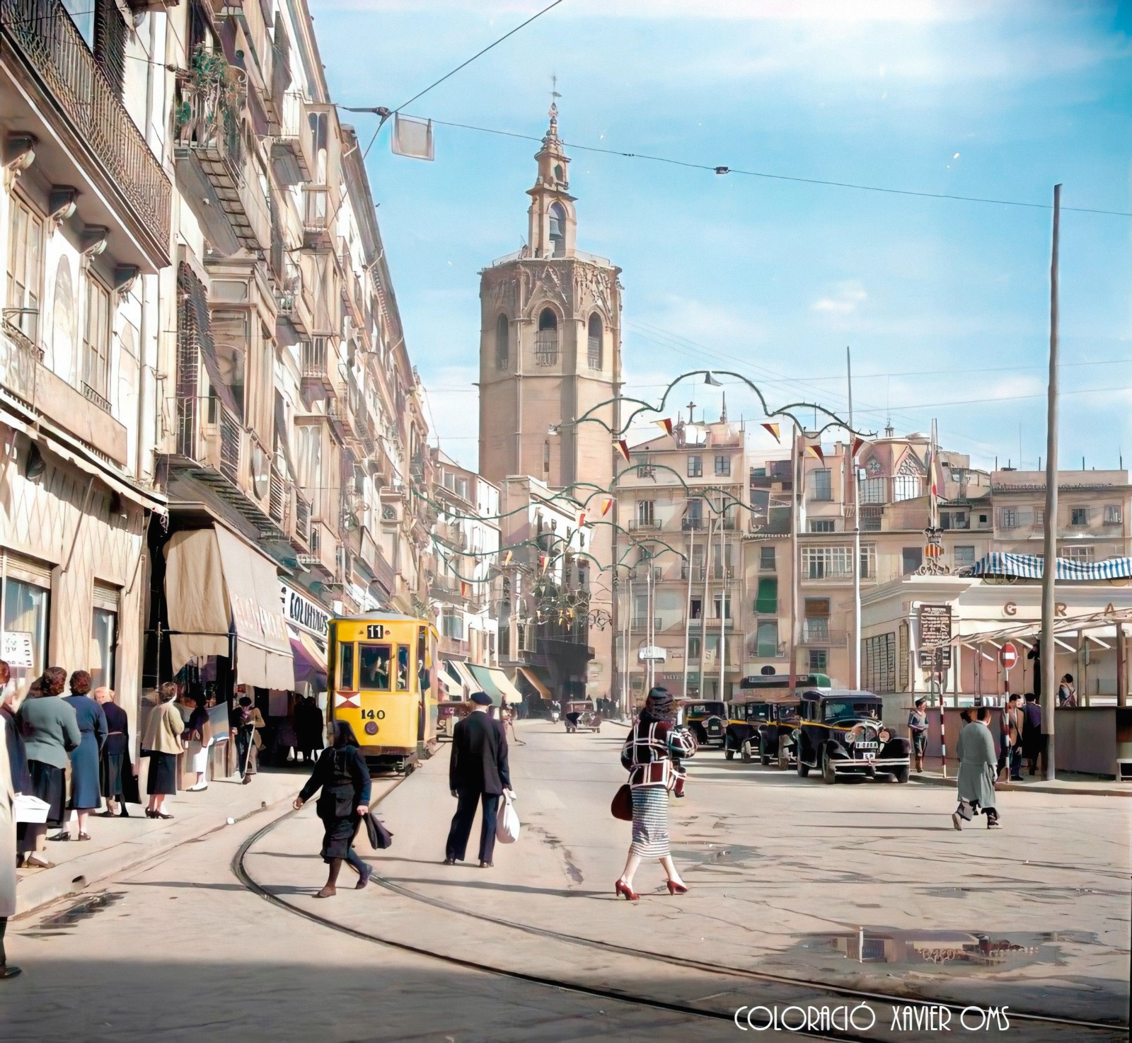 Era un matí d’aquells que anomenen d’entretemps, els bassals evidencien una pluja primaveral, o potser una d’aquelles que anuncien que l’estiu ha quedat arrere; encara que en la fotografia hi ha un parell de detalls que semblen assenyalar a l’inici de la primavera; i és que, d’una banda, encara romanen les garlandes amb gallardets, possiblement de les últimes festes falleres, mentres que, d’una altra banda, si ens fixem, a la dreta d’esta foto procedent del Fons Cuyàs i que l’Institut Cartogràfic i Geològic de Catalunya té datada com de 1953, s’observa la pissarra en la qual es detallaven els premis majors que havia repartit en els últims dies la Tómbola Valenciana de Caridad, l’edificació on estava penjada. Així les coses, atés que el període de funcionament de la tómbola solia ser des de Falles fins a la festivitat de la Mare de Déu dels Desemparats, el mes de maig, és més que probable que fora esta l’estació en la qual es va realitzar la fotografia.