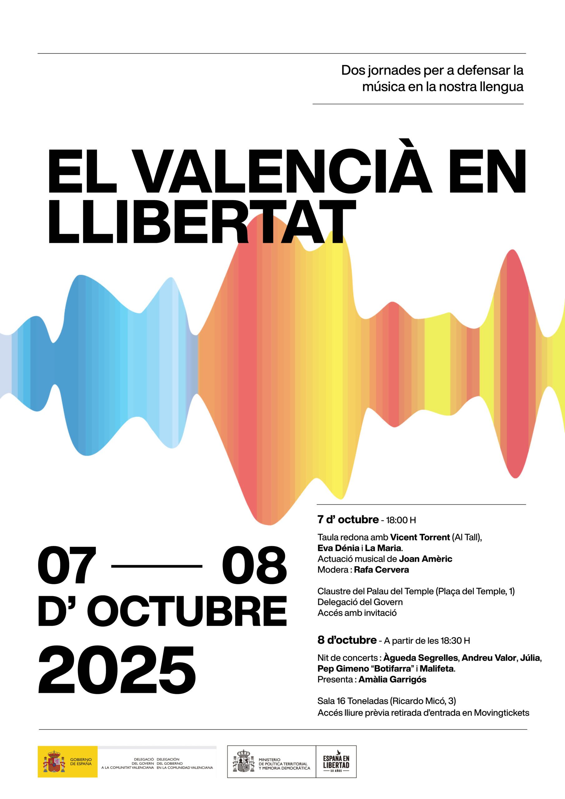 Este dimarts 7 i dimecres 8 d’octubre, la ciutat de València esdevindrà l’escenari de dos dies intensos en música i reflexió amb El valencià en llibertat, unes jornades –organitzades per la Delegació del Govern i el Ministeri de Política Territorial i Memòria Democràtica del Govern d’Espanya– que reivindiquen l’ús de la llengua pròpia com a ferramenta de construcció cultural i social. Amb motiu dels actes del 9 d’Octubre i de la celebració de l’aniversari del projecte Espanya en llibertat. 50 anys, es fusionen debat i concerts per a rescatar la memòria d’una música que va haver de lluitar per cantar en valencià i que continua encoratjant les noves generacions a seguir fer-ho en el present i en el futur.