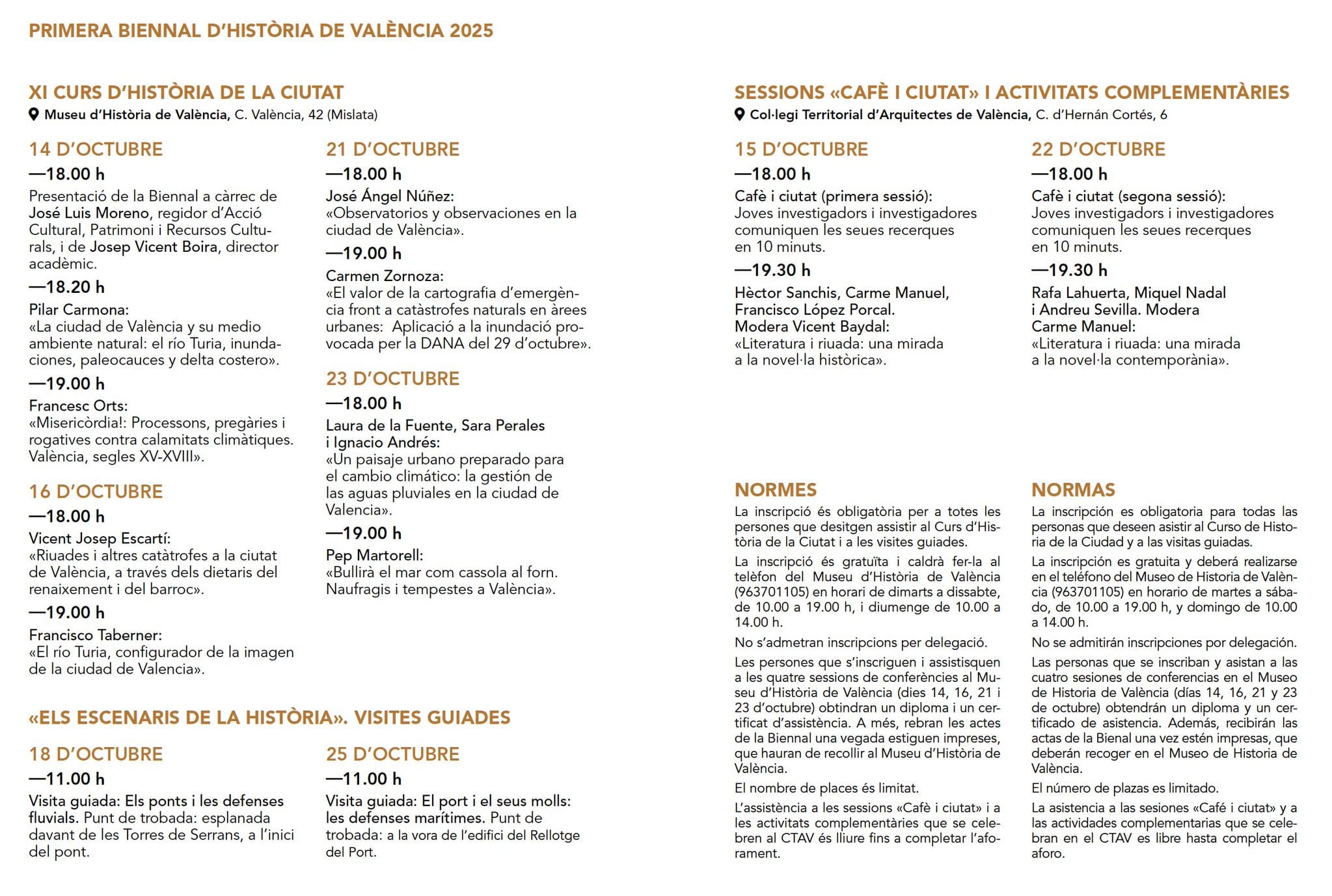 La ciutat de València es prepara per a un exercici de memòria i reflexió col·lectiva amb la celebració de la Primera Biennal d’Història i XIé Curs d’Història de València, organitzats per l’Ajuntament de València amb el suport de l’Acadèmia Valenciana de la Llengua, que enguany porten per títol La ciutat de València davant la natura. El risc ambiental en la història i el territori. Del dimarts 14 al dissabte 25 d’octubre, el Museu d’Història de València i el Col·legi Territorial d’Arquitectes acolliran un intens programa de conferències, debats i visites guiades que posaran el focus en la relació de la ciutat amb el seu entorn natural i els perills que, al llarg dels segles, han marcat la seua història.