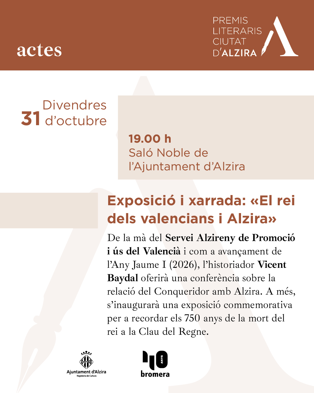 Este pròxim divendres 31 d’octubre, a les 19:00 hores al Saló Noble de l’Ajuntament d’Alzira, tindrà lloc la conferència titulada “El rei dels valencians i Alzira”, a càrrec de l’historiador Vicent Baydal, dins del marc de les Jornades Culturals 2025 – Premis Literaris Ciutat d’Alzira. L’acte està organitzat pel Servei Alzireny de Promoció i Ús del Valencià com a avanç de l’Any Jaume I el 2026, coincidint amb la commemoració dels 750 anys de la mort del monarca a la Clau del Regne.
