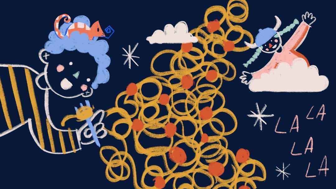 Mentre dormia somiava que estava despert i menjava una torre gegant d’espagueti en companyia d’un camaleó, de quadres blancs i taronja. Mentrestant, la seua amiga Carmeta, amb un casc de vikinga, cantava òpera damunt d’un núvol blanc.