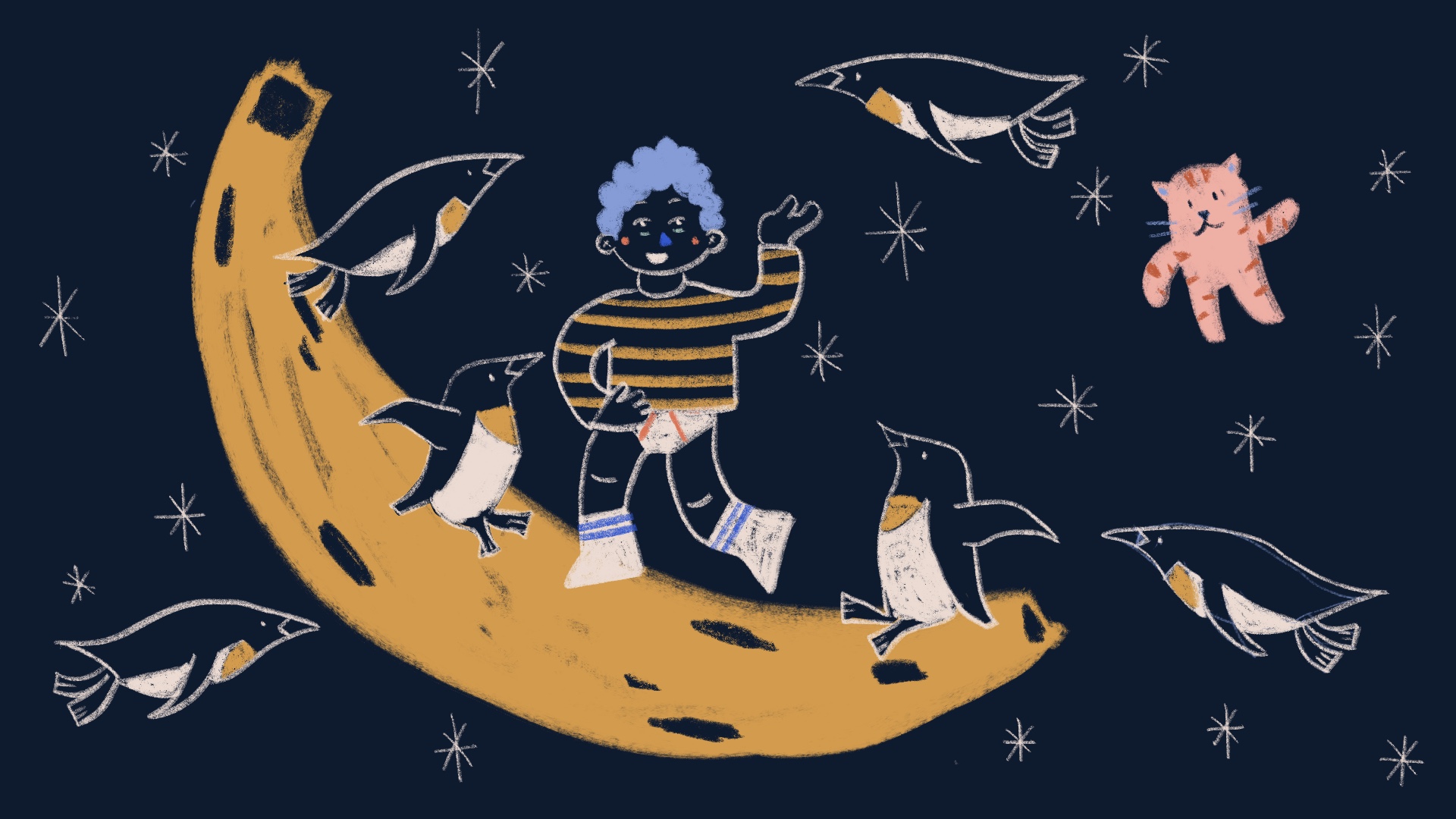 Mentre dormia somiava que estava despert: anava al col·le amb elefant, no portava pantalons i les llentilles del menjador feien gust de xocolate. Després de dinar, un gat el portava volant a la lluna, que era un plàtan, i allà ballaven xarleston amb uns pingüins.